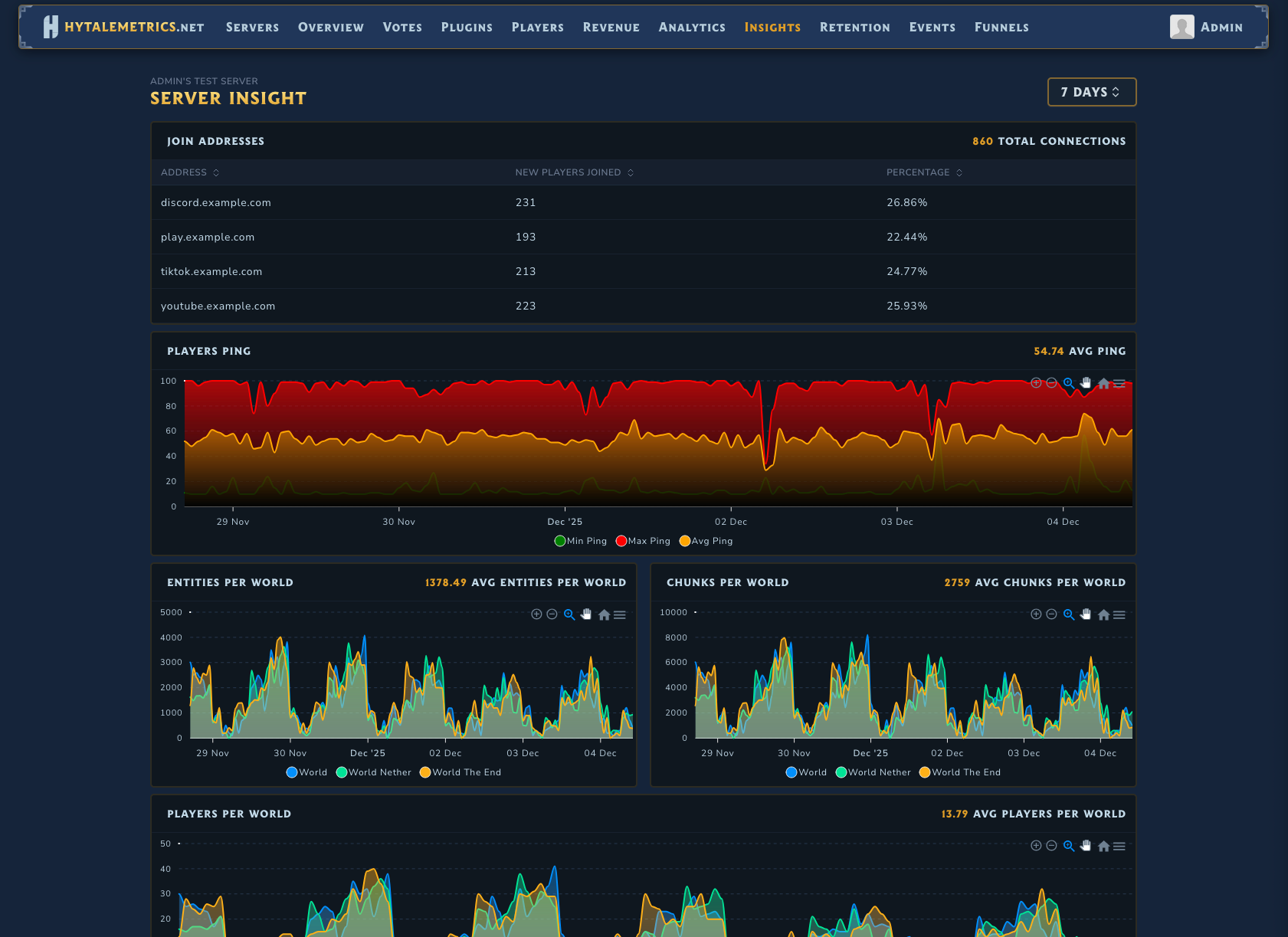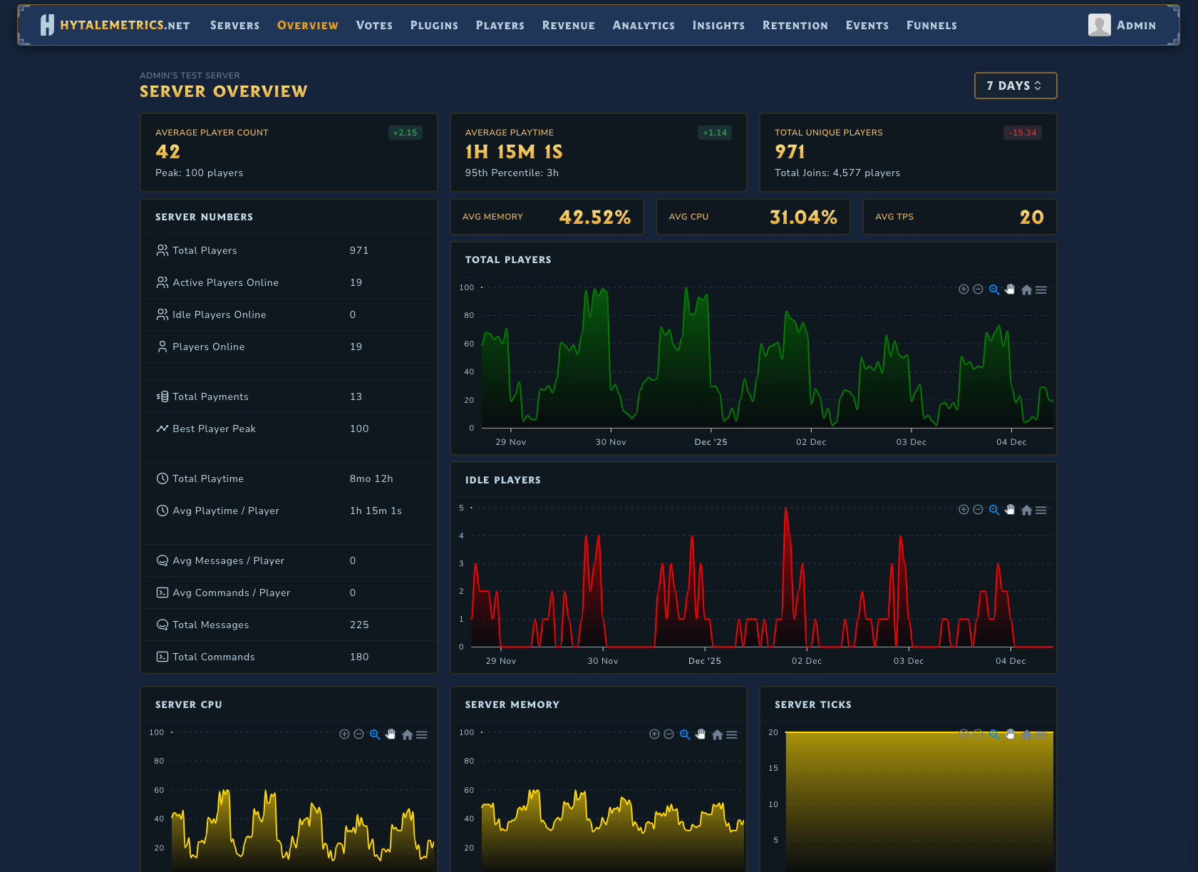 Track every aspect of your Hytale server with real-time analytics, player behavior insights, and performance metrics designed for server growth.